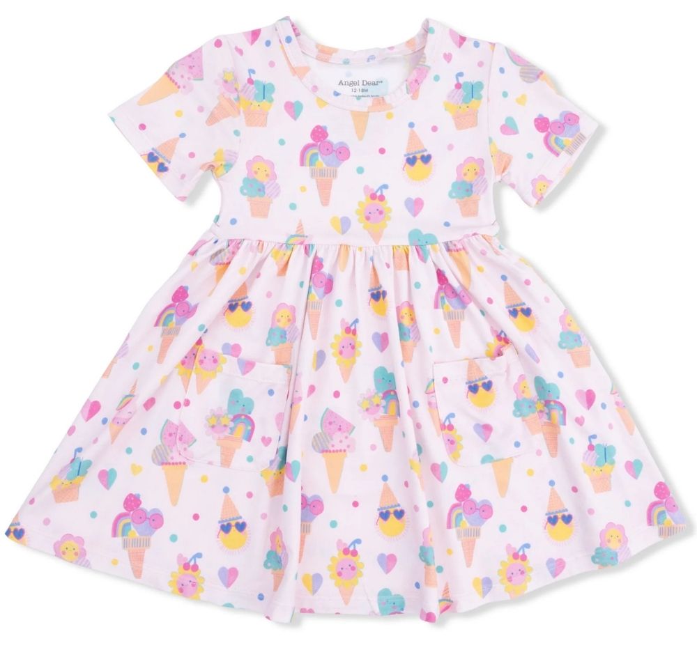 Vestido divertido y cómodo para bebé de la marca Angel Dear, pensado para niñas. Diseñado con falda twirly que gira al jugar y un short tipo Carthwheel integrado para mayor comodidad y libertad de movimiento. Estampado alegre con motivos de helados que aporta un toque veraniego y juguetón.