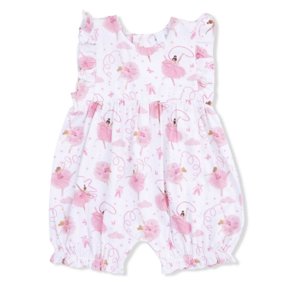 Encantador playsuit para bebé de la línea Ribbon Ballerinas de Angel Dear, diseñado especialmente para niñas de meses. Con volantes delicados y detalles tipo lazo que aportan un toque romántico y femenino, este body-playuit combina comodidad y estilo para el día a día y ocasiones especiales.