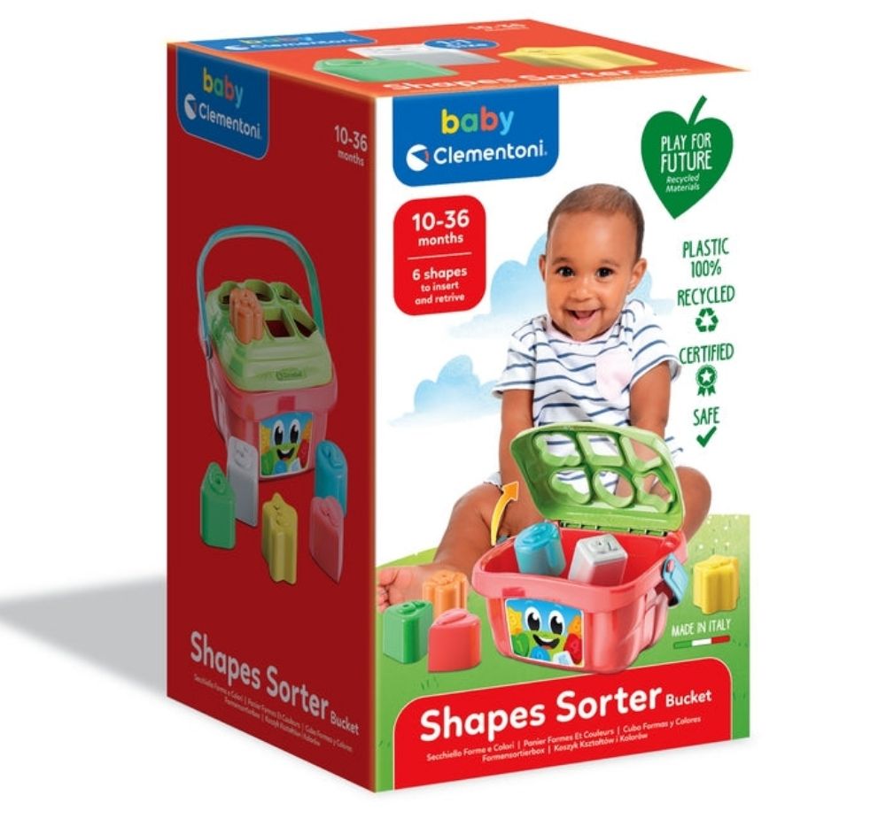 Shape Sorter Bucket de Clementoni es un juego clásico de clasificación de formas pensado para los más pequeños. Un cubo con tapa perforada y piezas con formas y colores diferentes que invita al bebé a encajar, abrir y vaciar, fomentando el aprendizaje a través del juego.