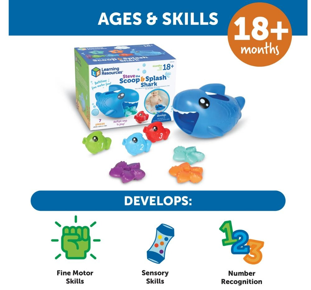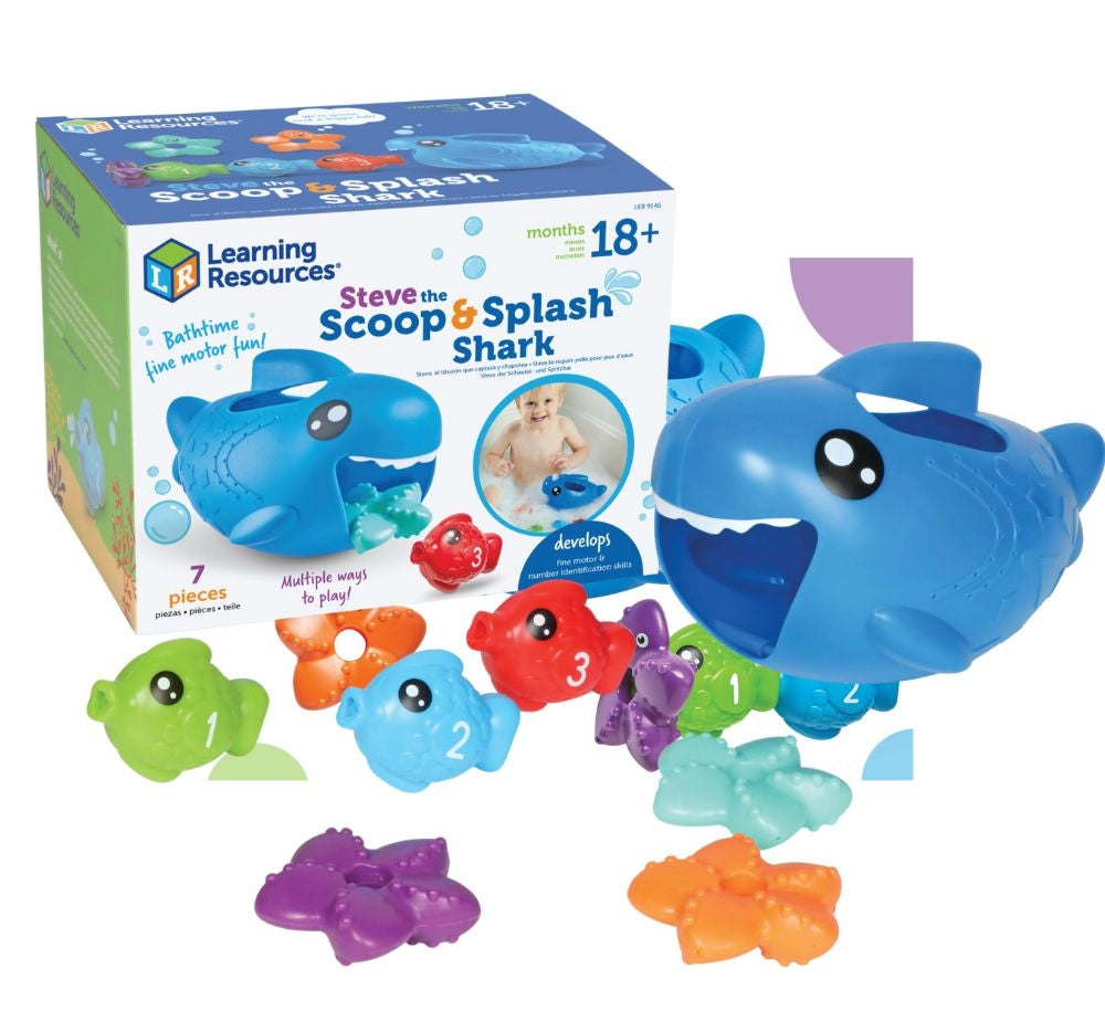 Este tiburón bebé está listo para divertirse a la hora del baño! Explora las actividades versátiles de este set: recoge los peces con la minipala para tiburones, llena a tu tiburón con agua y tírala por la boca, o junta los peces mientras cuentas del 1 al 5. La cola articulada del tiburón incluso nada de un lado a otro mientras se mueve por el agua. Las piezas se guardan dentro del tiburón para una limpieza fácil.