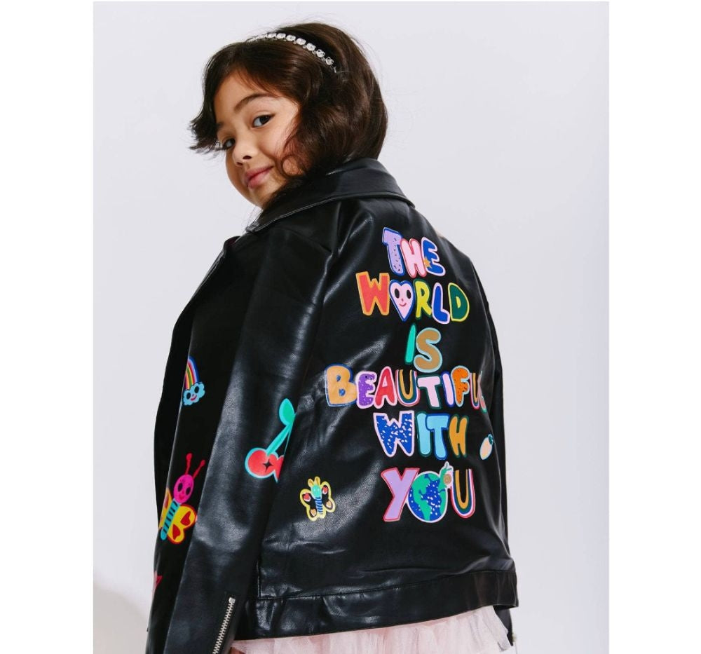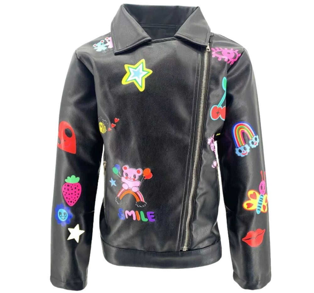 Elegante chaqueta de cuero vegano con vibrantes diseños artísticos de garabatos.