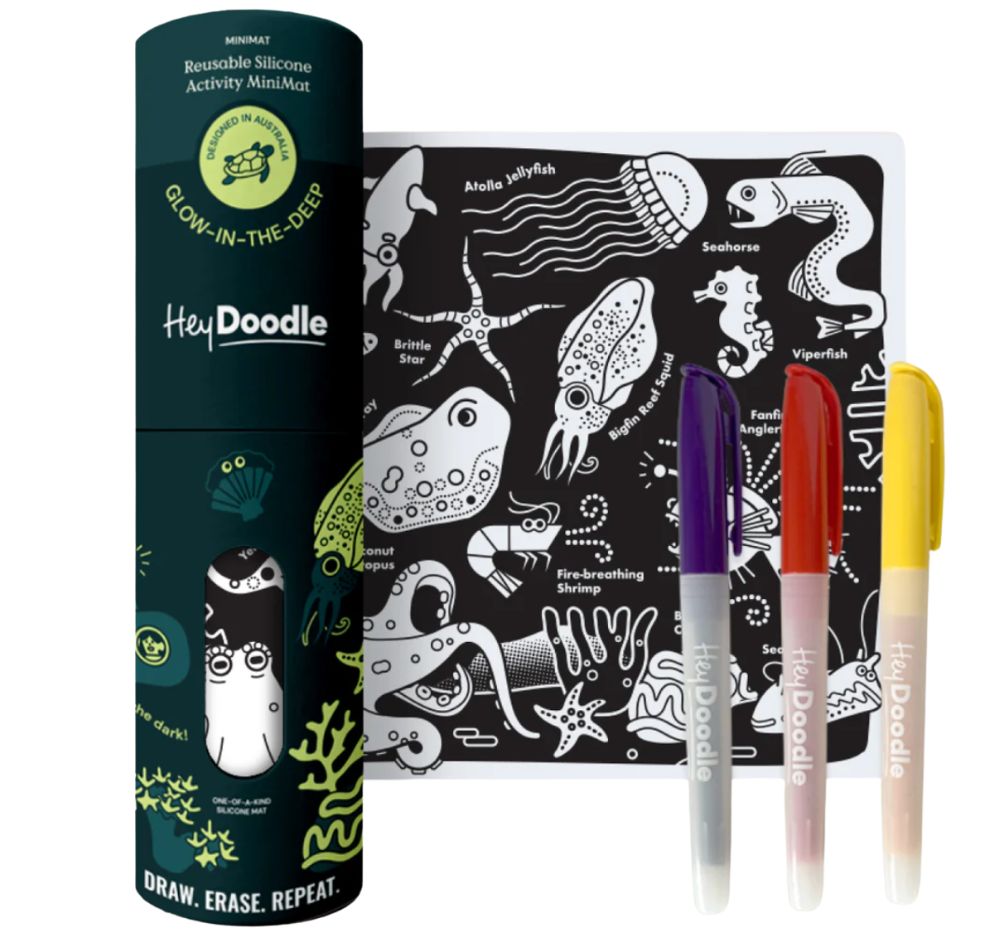 Sumérgete en la creatividad con el mini tapete que brilla en la oscuridad, una versión compacta de nuestro diseño más vendido que brilla en la oscuridad de la gama HeyDoodle Classic.
