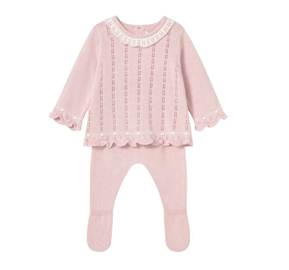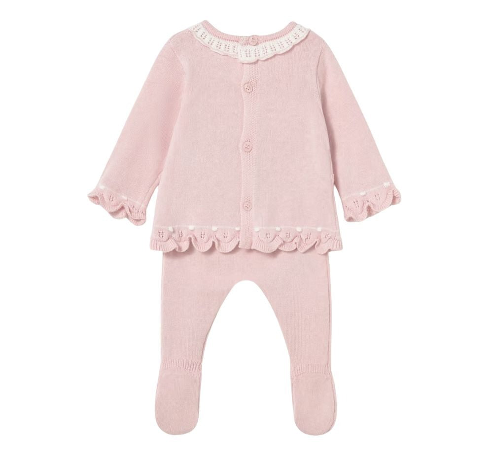 Conjunto tricot en color cuarzo, pensado para las primeras semanas del bebé. Diseño delicado y cómodo de la marca Mayoral, ideal para vestir a la recién nacida con suavidad y estilo.