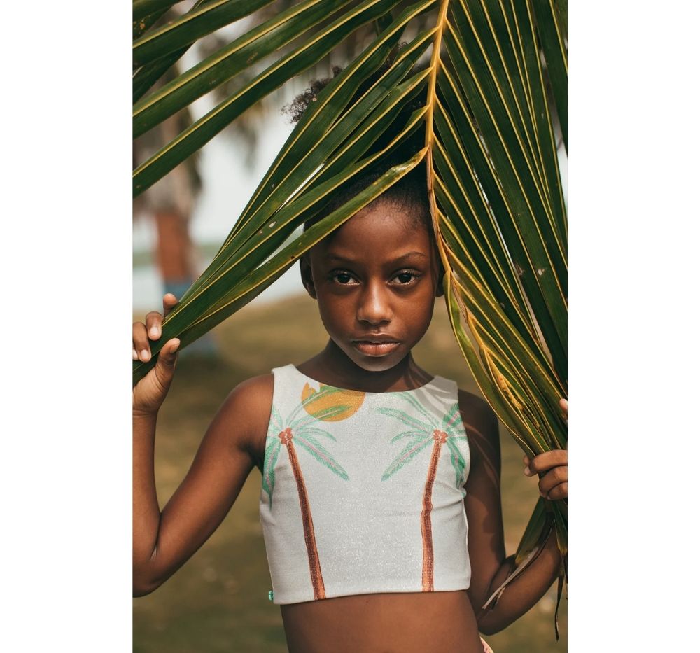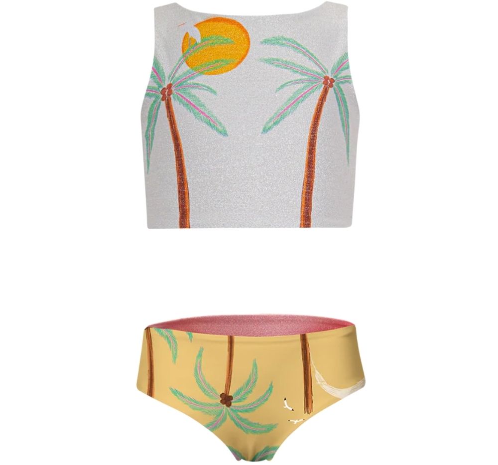 El top es sin mangas, con cuello redondo y estampado en el frente con palmeras y sol. La parte posterior es lisa. El panty es reversible, por un lado tiene estampado de palmeras y por el otro es dore rosado shine. Confeccionado en tela elástica que permite moverse con comodidad dentro y fuera del agua. Hecho en Colombia
