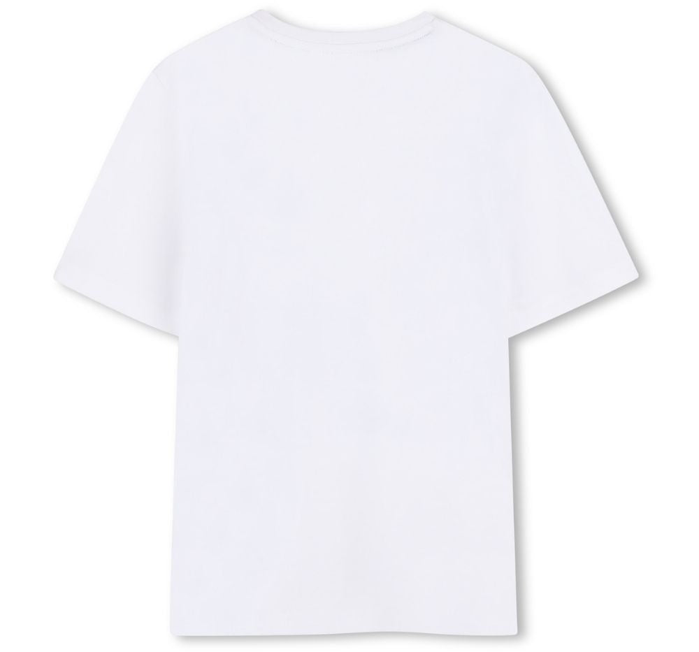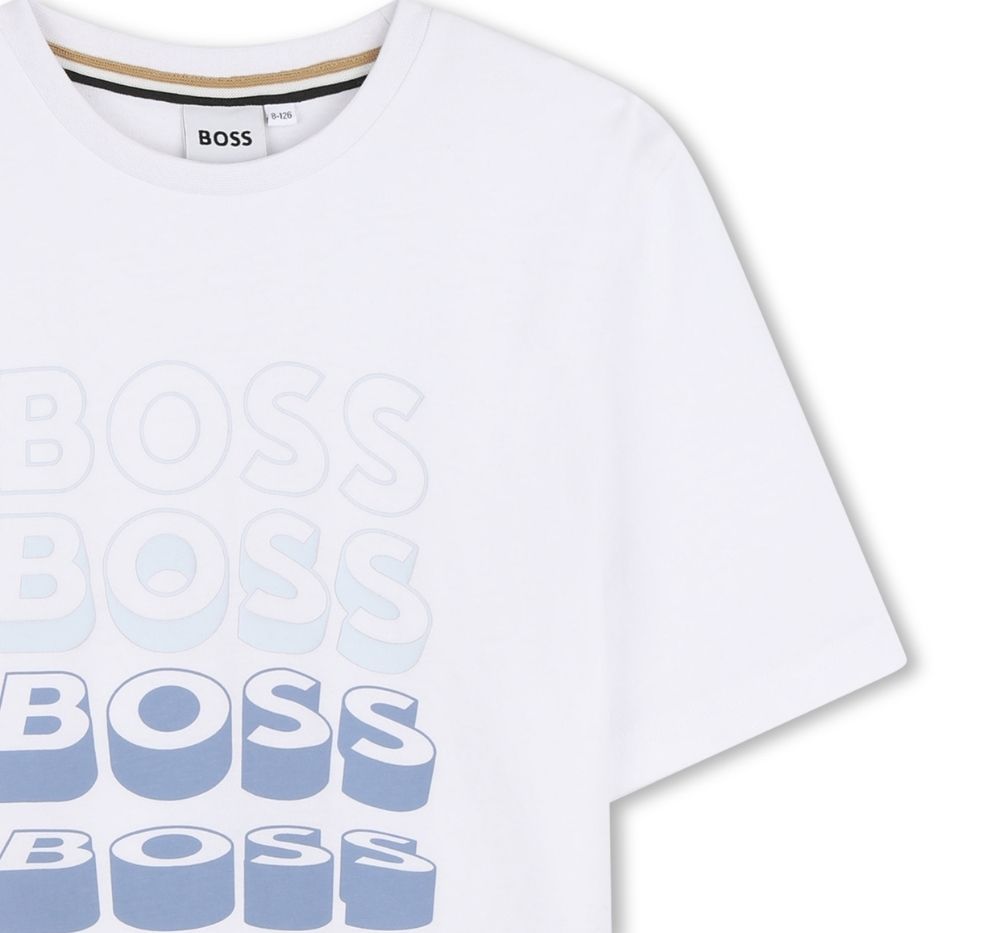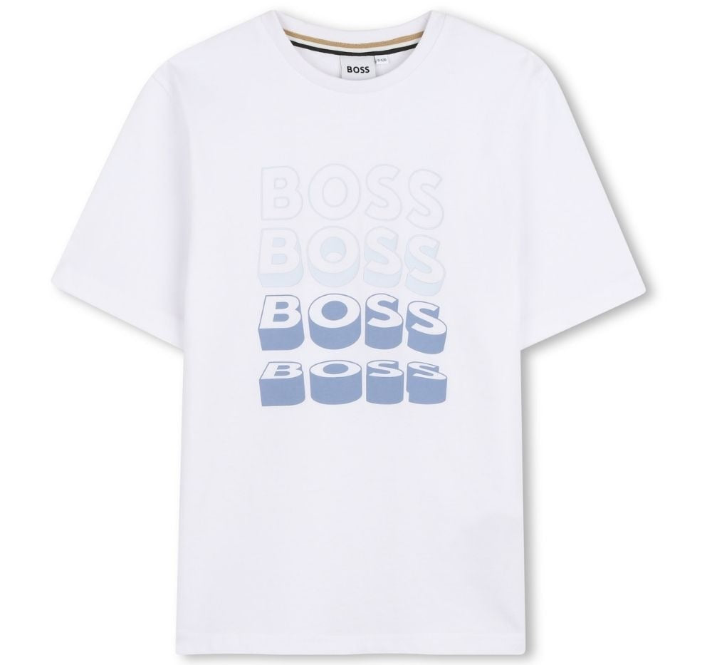 Camiseta Hugo Boss en blanco puro, diseñada para niños. De corte clásico y cómodo, presenta el icónico logo "Boss" serigrafiado en el pecho, ofreciendo un look limpio y sofisticado ideal para el día a día o salidas informales. Tejido suave y transpirable que garantiza confort durante todo el día; fácil de combinar con pantalones, bermudas o sudaderas.