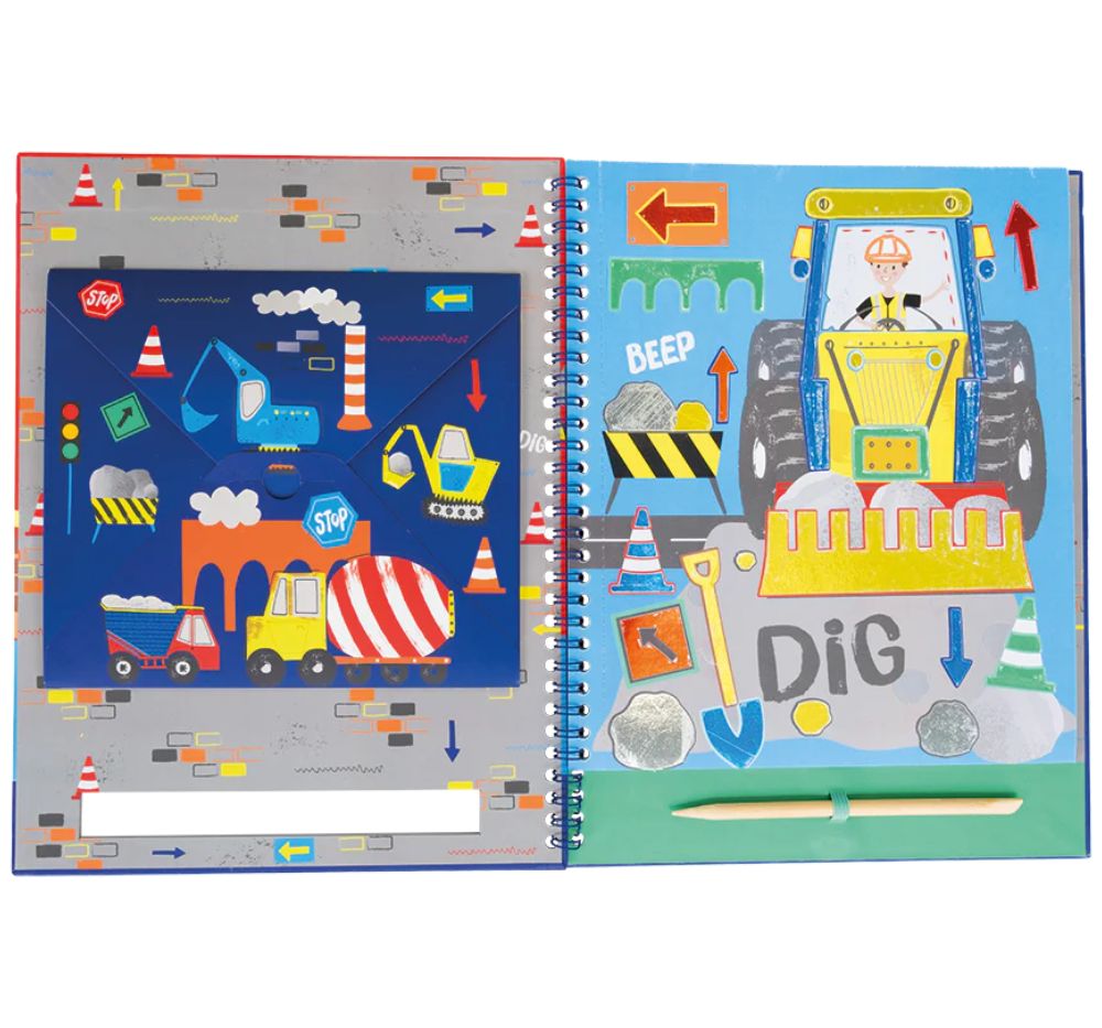¡Haz que todo brille y resplandezca con 8 divertidas páginas ilustradas para decorar! Despega una pegatina blanca, selecciona una lámina y frótala sobre la zona de la pegatina con el lápiz de madera para crear un dibujo increíble. Este diseño de Construcción contiene 20 láminas de diferentes colores, 8 páginas y un lápiz óptico de madera, todo en un práctico libro encuadernado en espiral.