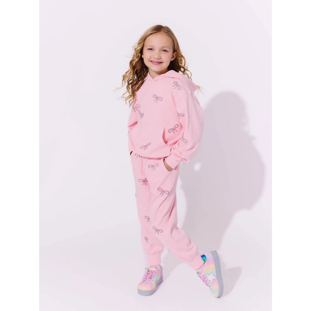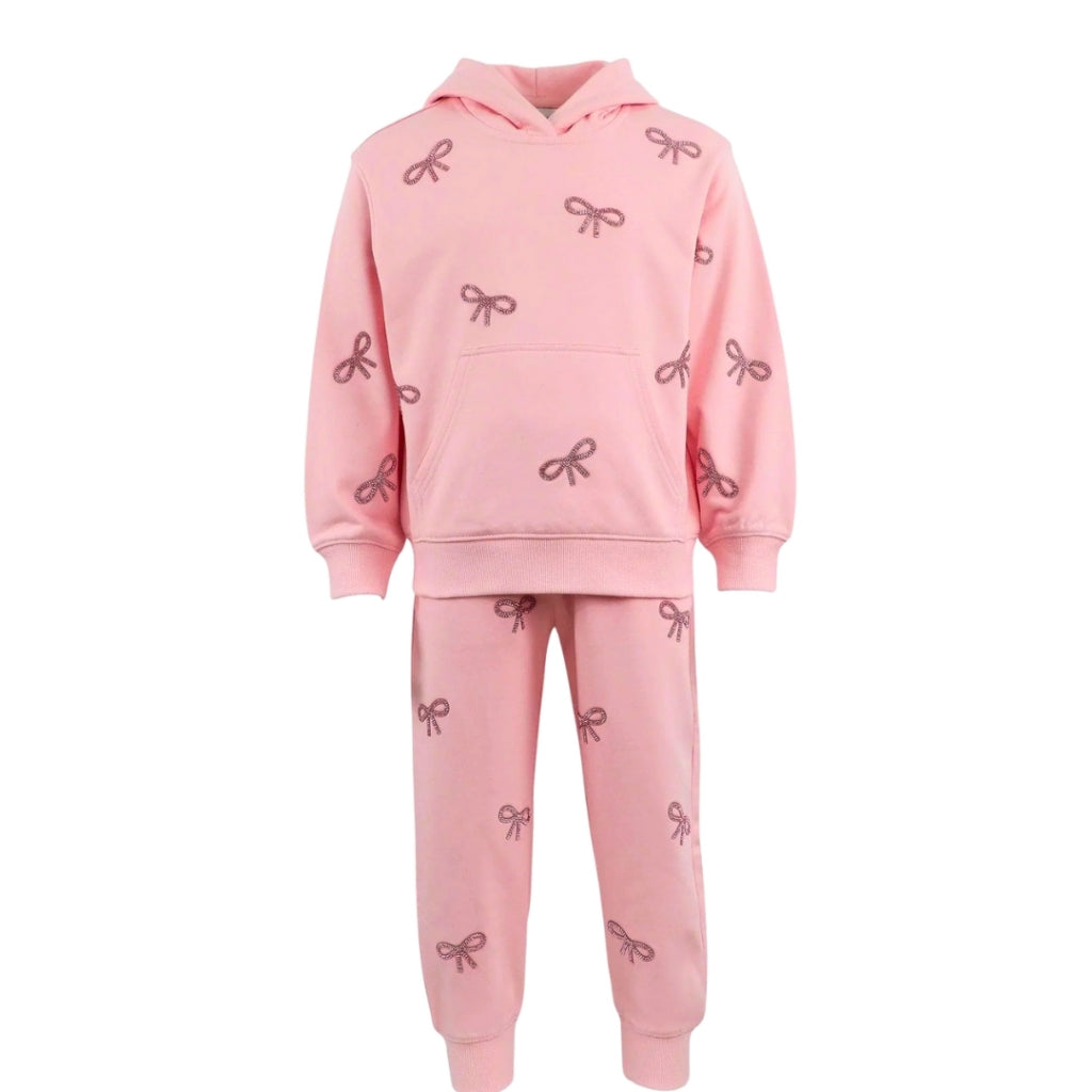 -Adorable conjunto de dos piezas que incluye una sudadera con capucha y pantalones deportivos, ambos adornados con adornos de lazos de cristal brillante.
